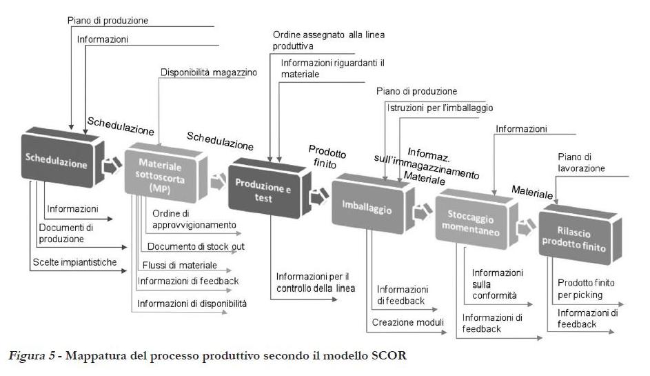 La prima mappatura, effettuata a un livello di dettaglio molto aggregato, ha consentito di individuare i principali attori coinvolti nella catena logistica mettendo in evidenza come le due sedi produttive italiane dell’azienda, seppur collocate in luoghi diversi e con processi produttivi differenti, presentano le stesse dinamiche, sono strettamente connesse tra loro e condividono un buon numero di clienti e fornitori. Tramite SCOR sono stati individuati i cinque macro-processi principali (pianificazione, approvvigionamento, produzione, consegne e ritorni), le relative categorie di processo (Make-To-Stock, Make-To-Order, Engineering-To-Order) ed i relativi elementi di processo con i rispettivi input ed output. Il risultato sono cinque mappature come quelle presentate in Figura 5, dove a titolo d’esempio è riportato il processo produttivo. Esso è scomposto nei suoi elementi di processo per i quali è stato possibile individuare gli elementi in input che permettono lo svolgimento dell’attività e gli output ottenibili.