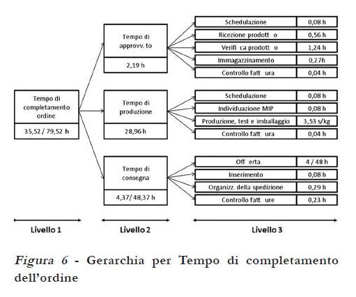 Sono state individuate cinque metriche di Livello 1 e sono state articolate fino al Livello 3. L’esempio riportato riguarda la metrica Tempo di completamento dell’ordine (per ragioni di riservatezza i valori inseriti sono indicativi e non sono reali). Si può notare come la definizione di una struttura gerarchica è un utile strumento nelle mani del management perché a partire da pochi indicatori di livello aggregato (Livello 1) è possibile tenere sotto controllo l’andamento delle performance dell’intera catena logistica. Consente di rilevare facilmente eventuali valori al di sotto dei target fissati e di risalire alle cause di un problema. Ad esempio, nel caso riportato, la variabilità del tempo di completamento dell’ordine dipende fortemente dalla variabilità del tempo di consegna, il quale a sua volta dipende dalla variabilità del processo di offerta che può risultare di 4 ore per l’evasione di un ordine standard fino a 48 ore per l’evasione di un ordine aggregato.
